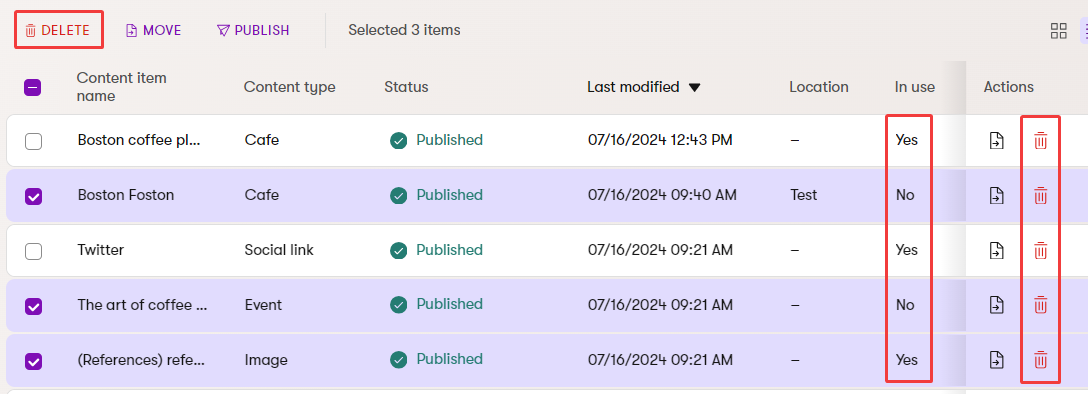 - Se il content item eliminato viene utilizzato in altri contenuti, potrebbe essere necessario controllarne l'uso e modificare tutti gli altri contenuti in cui è utilizzato