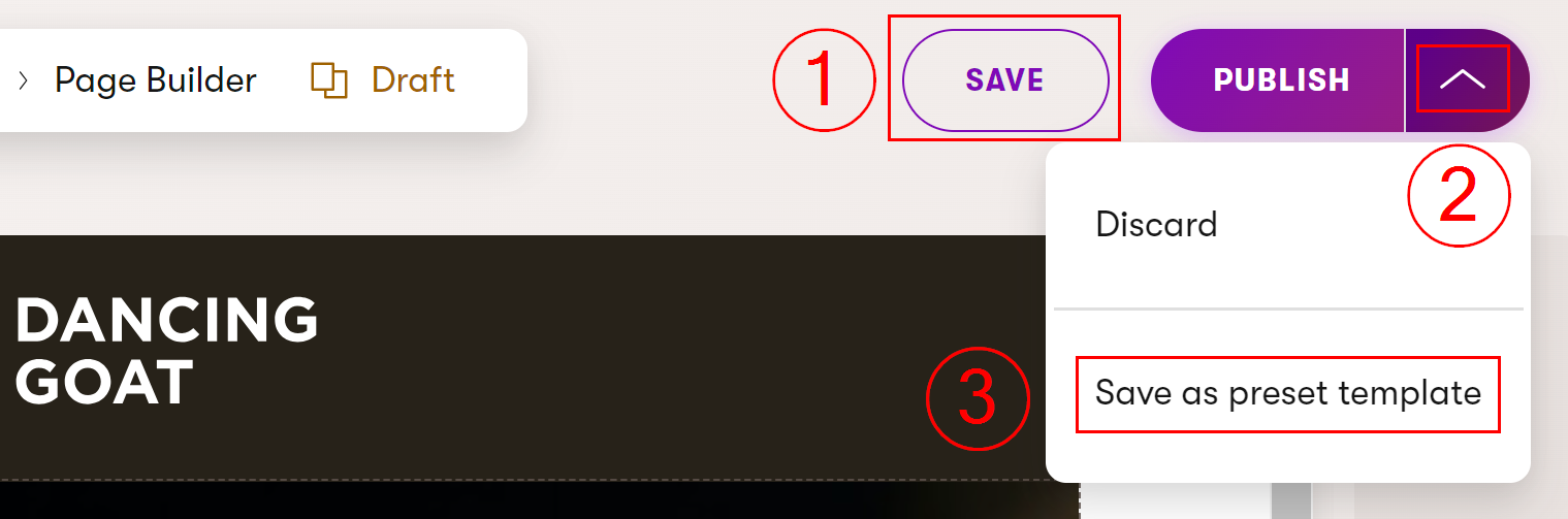 Gli editor possono salvare questa pagina come template preimpostato (preset page template) con il contenuto del Page Builder creato nella pagina. Consulta Salvare pagine come template preimpostati.