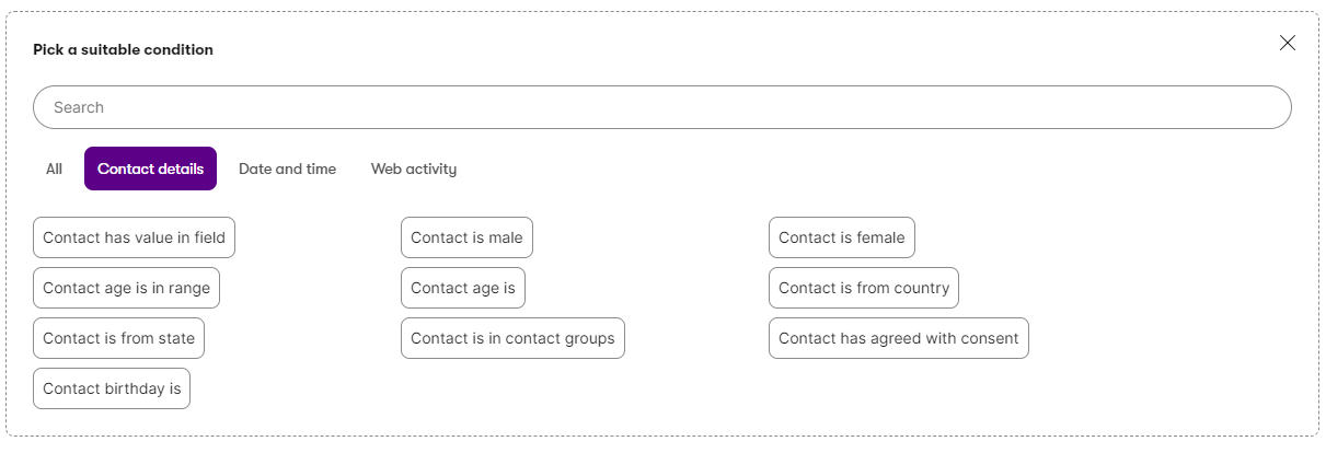 I contact group dinamici raccolgono automaticamente tutti i contatti che soddisfano determinati criteri. Puoi definire questi criteri tramite condizioni (Conditions).