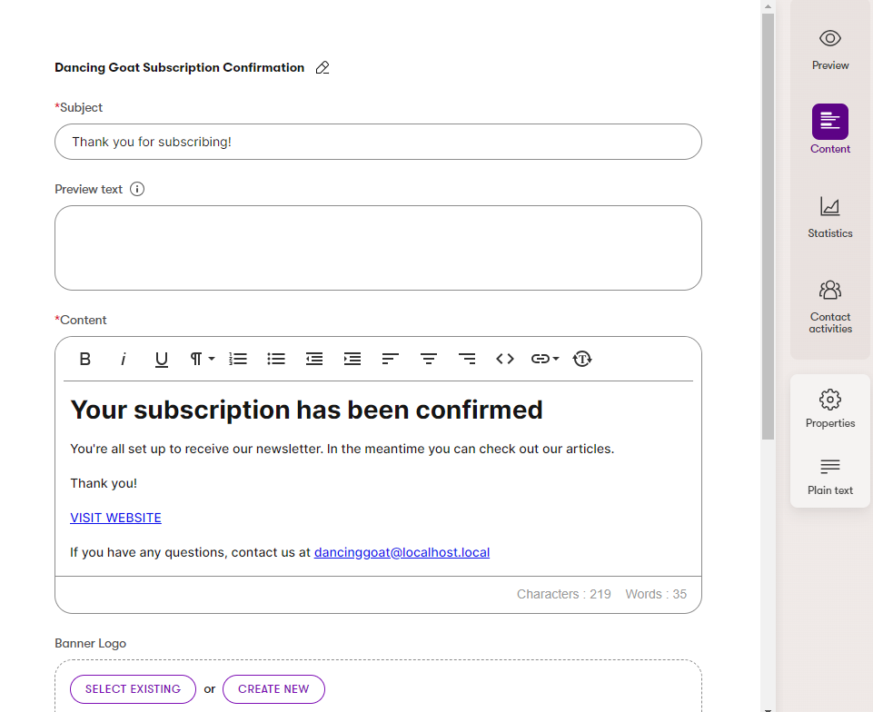 - Content – consente di modificare i campi del contenuto dell'email, nonché l'oggetto dell'email e il testo di anteprima. Mentre sei nella modalità di visualizzazione Content, puoi espandere i seguenti pannelli: